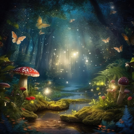 The enchanted forest has mushrooms, fireflies, butterflies, and other creatures. - image generated with Generative AI