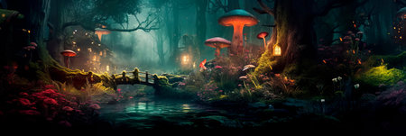 Fantasy forest landscape with trees and road, fireflies and mushrooms.