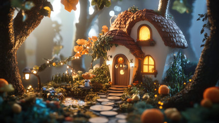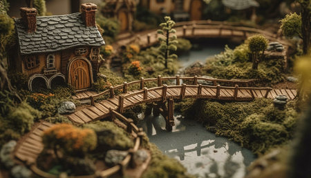 A captivating miniature village scene with charming details. Wooden bridges cross a tranquil stream, winding paths lead to a cozy cottage nestled in a mossy landscape.