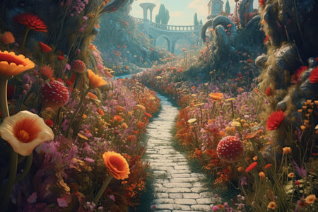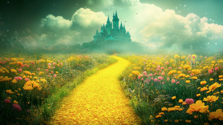 A whimsical pathway of golden petals leads through a vibrant flower field towards a mystical castle. Enchanted scenery promotes feelings of wonder and exploration.