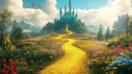 A magical landscape features a vibrant yellow pathway leading to an enchanted castle amidst blooming flowers and majestic mountains, creating a fantasy scene.