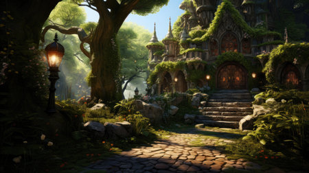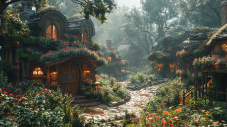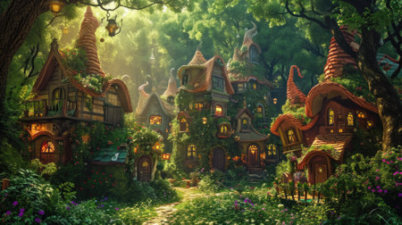 Nestled in an enchanted forest, this village boasts whimsical fairytale cottages surrounded by lush greenery and blooming flowers. Resplendent.