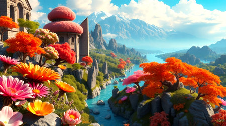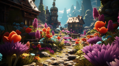 Fantasy landscape with flowers and mountains. 3d render illustration.