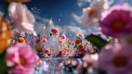 A captivating floral scene showcasing vibrant colors, delicate flowers, and a mystical castle under a clear blue sky, perfect for whimsical designs.