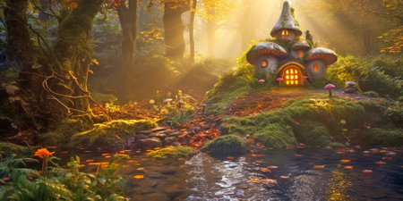 House in Enchanting fairy tale woodland. Surreal mystical fantasy artwork. Generative AI.