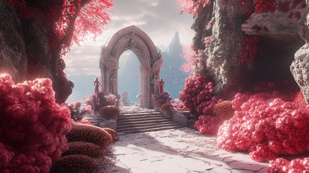 Fantasy landscape with fantasy portal and red plants. 3d rendering