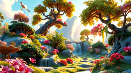 An AI illustration of A digitally created art piece depicting a lush, vibrant and enchanted garden landscape, with a myriad of trees, shrubs and plant