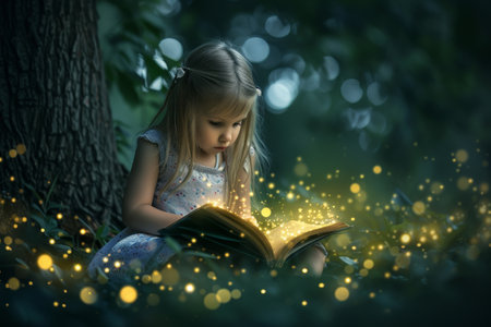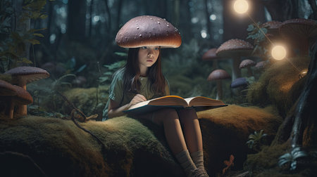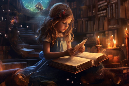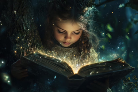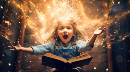 Young girl discovers magic through an enchanted book. Creating using generative AI tools