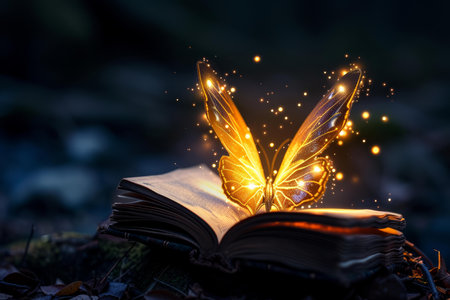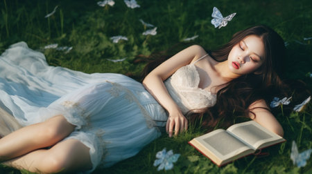 A woman reads a book while butterflies flutter around her in a soft, dreamlike setting. The composition showcases warm tones and soft lighting, highlighting the subject's expression. This image would be suitable for artistic projects, book covers, or editorial content related to fantasy, magic, or literature.
