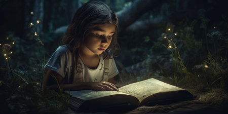 Little girl reading a book in the dark forest at night. The concept of education and reading.