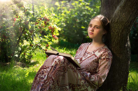 Pretty cute adult human sit rest relax look study old life hope. Sun light day backdrop open page closeup view text space. Antique kid lady holy Christ god gospel church school history hobby student