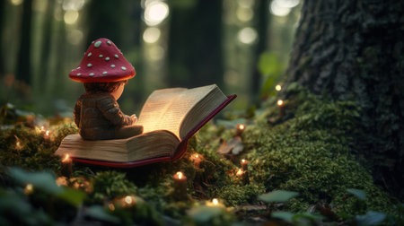 An ancient, illustrated storybook lies open on a bed of vibrant green moss, its pages seemingly merging with the surrounding enchanted forest.