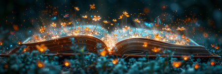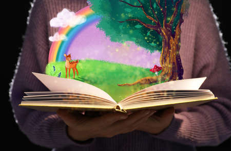 Open magical book that contains fantastic stories, Reading books and literature allows you to plunge into world of imagination, opens boundaries for fantasy, to build your own world
