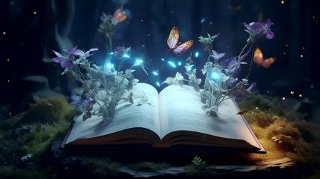 Magic book with flowers and butterflies. Fantasy background. 3d rendering