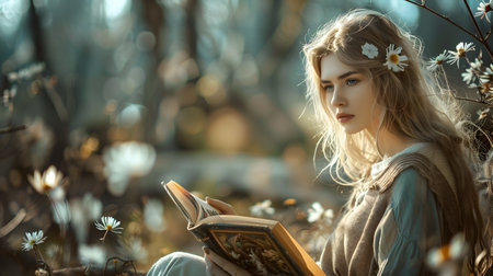 A captivating image of a woman her blonde hair adorned with delicate daisies lost in the enchantment of a book as she sits amidst the serene beauty of a lush sunlit forest