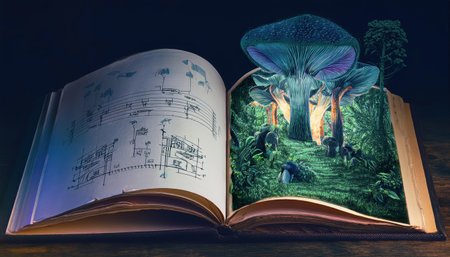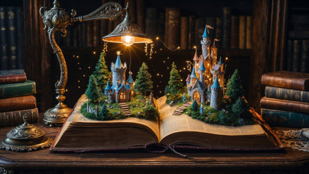This enchanting image features an open book revealing a vibrant fantasy world with a castle, lush trees, and sparkling elements, evoking creativity and imagination.