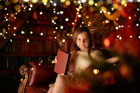 Magic for Christmas. Cute little girl reads fairy tales sitting in a cozy armchair by the New Year tree, surrounded by lights. Christmas Eve.