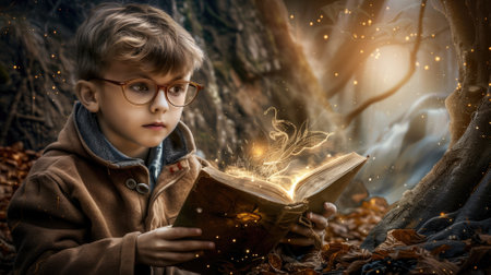 In a sunlit forest, a young child sits captivated, reading a book, as a mythical creature with glowing eyes appears, bringing the story to life with enchanting sparks of magic and wonder.
