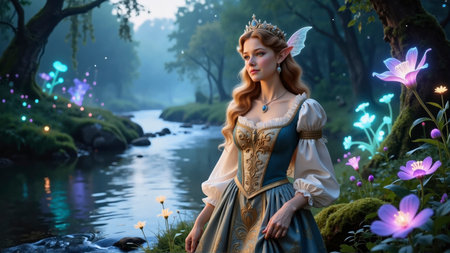 A beautiful elf princess with a crown and delicate wings stands beside a flowing stream in a magical forest filled with glowing flora and ethereal lights, Generative AI.