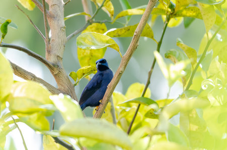 Tropical Purple Honeycreeper bird perched in a citrus tree in the Caribbean.