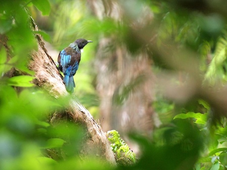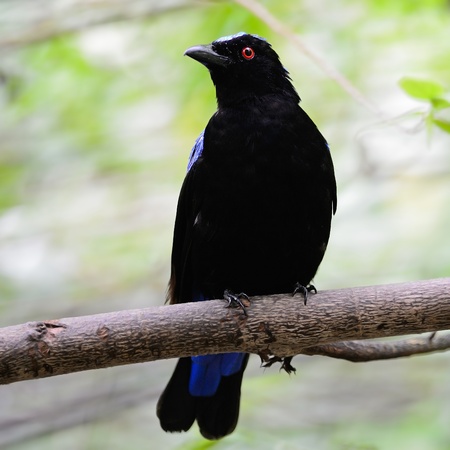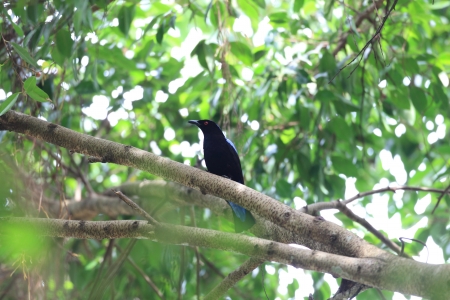 beautiful black and blue bird on a branch in the rainforest