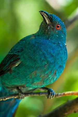 Female Asian fairy-bluebird (Irena puella) very close up, a beautiful blue tropical bird (portrait view)