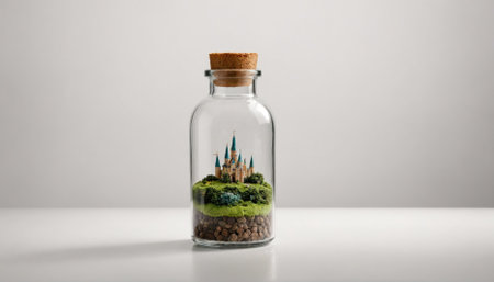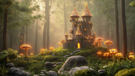 A whimsical fairy tale castle nestled in a lush forest, glowing mushrooms illuminate the scene, evoking a magical atmosphere perfect for fantasy lovers.