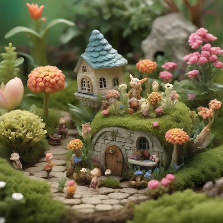 A whimsical fairy house nestled in a vibrant forest, surrounded by mushrooms and lush greenery, creating a magical and enchanting scene.