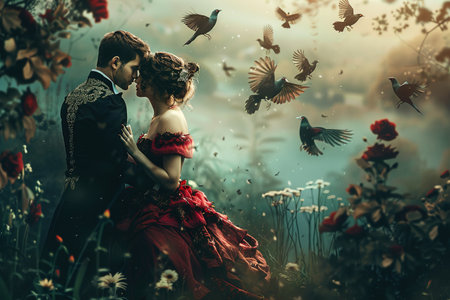 A couple is shown in a forest with birds flying around them. Scene is romantic and dreamy