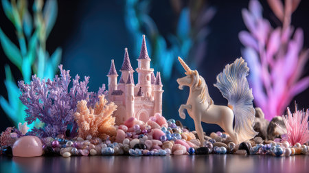 A whimsical scene presents a white unicorn standing near a detailed castle. The composition features vibrant coral-like structures in diverse colors, along with scattered gemstones. Soft lighting creates a dreamlike atmosphere. This image is suitable for imaginative storytelling, children's content, or decorative design projects.