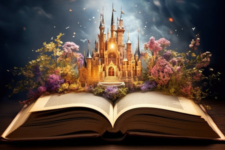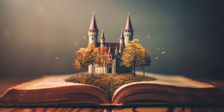 Magic book with fairy tale castle in the forest. Fairy tale concept
