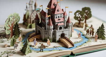 An open book reveals an intricate and magical 3D pop-up scene of a medieval fairytale castle. Tiny paper characters walk along a path next to a river that flows under a bridge, surrounded by handcrafted trees. The image captures the wonder of storytelling, imagination, and the art of papercraft.