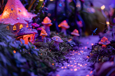 A fantastical miniature landscape featuring glowing mushroom houses and fungi, illuminated by soft purple and orange lights. A dragonfly flits through this magical realm, creating an otherworldly atmosphere.