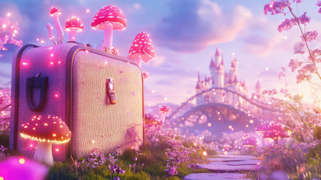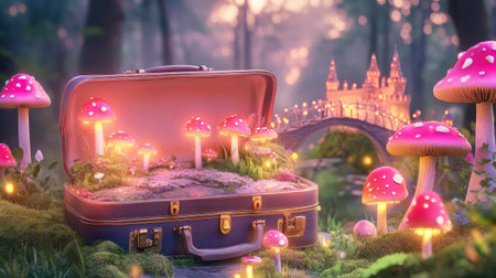 This whimsical scene presents a magical open suitcase surrounded by glowing mushrooms and a distant fantasy castle under soft twilight light, inspiring wonder.