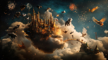 3D animals throwing a magical party in a cloud castle, dancing on a rainbow bridge as fireworks paint the night sky.