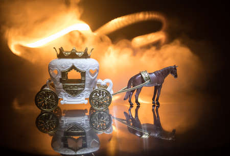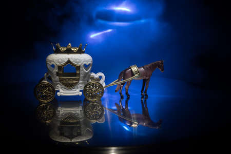 Little carriage with horse miniature on table. Creative decoration on dark toned foggy background. Selective focus