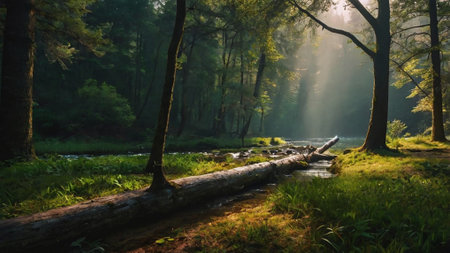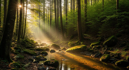 Sunbeams pierce a mystical forest, illuminating lush greenery. Peaceful nature.
