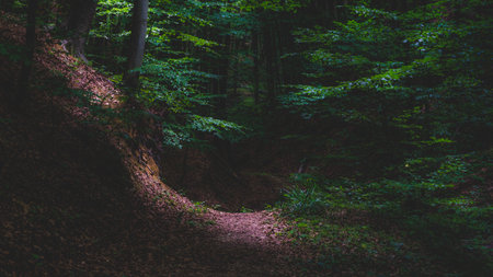 A mystical trail leads through a dense forest, illuminated by soft morning light and surrounded by greenery.