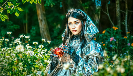 Beautiful Snow White with a poisonous apple in a magical forest.