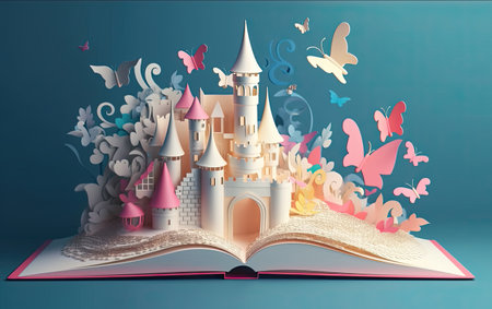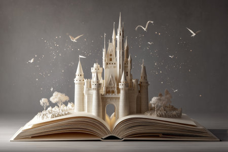 An enchanting castle rises from the pages of an open book, set against a backdrop of fluffy clouds and a dreamy sky. The scene combines elements of fantasy and storytelling, showcasing vibrant colors and intricate architecture.