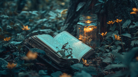A mysterious scene of an open book placed on the ground in a dimly lit forest, with glowing candlelight inside a glass jar and yellow flowers, creating a magical atmosphere.