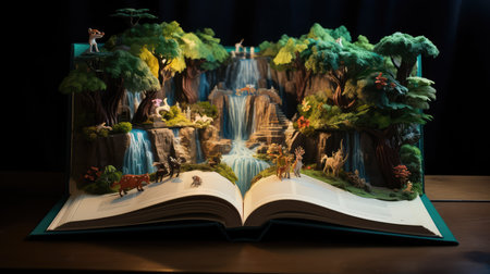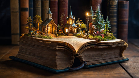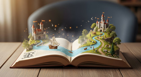 A magical scene where a vibrant, three-dimensional fairy tale world, complete with castles, a winding river, and a sailing ship, emerges from the pages of an open book resting on a wooden table. This image beautifully illustrates the power of storytelling, imagination, and literature.