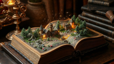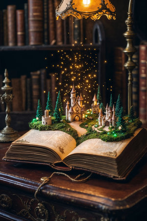 This enchanting image features an open book revealing a vibrant fantasy world with a castle, lush trees, and sparkling elements, evoking creativity and imagination.