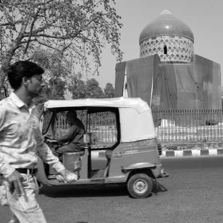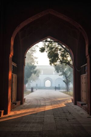 New Delhi India – March 7 2021 : Inside view of architecture tomb inside Sunder Nursery in Delhi India, Sunder Nursery is World Heritage Site located near Humayun's Tomb in Delhi - Black and White