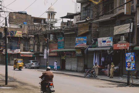 Peshawar, Pakistan - July 20, 2021: Daily life of the crowded Pakistan city center with the Buildings and Rickshaws