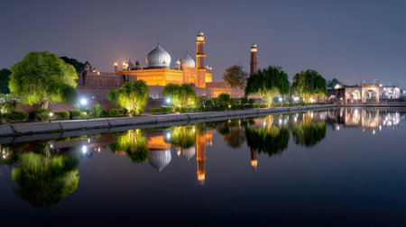 A stunning night view of a historic monument featuring illuminated domes and minarets, surrounded by serene water and lush greenery, creating a tranquil atmosphere.