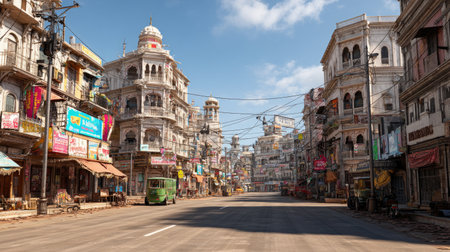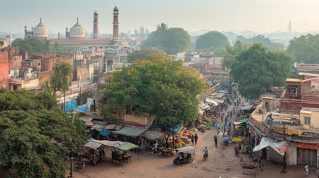 A picturesque market scene showcases vibrant street life and historical architecture, capturing the essence of an Indian city at dawn.