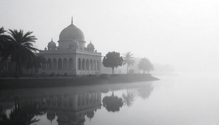 Foggy landscape with building reflecting in still water