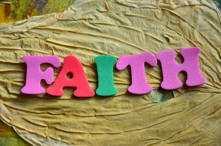 Faith word written on stacked up wood cubes. White background and grey color tabletop.