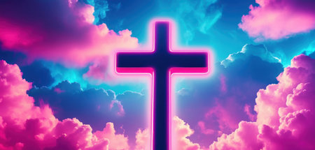 A captivating scene featuring a silhouetted cross against a dramatic sunset, with swirling colorful clouds creating a vibrant and serene atmosphere.